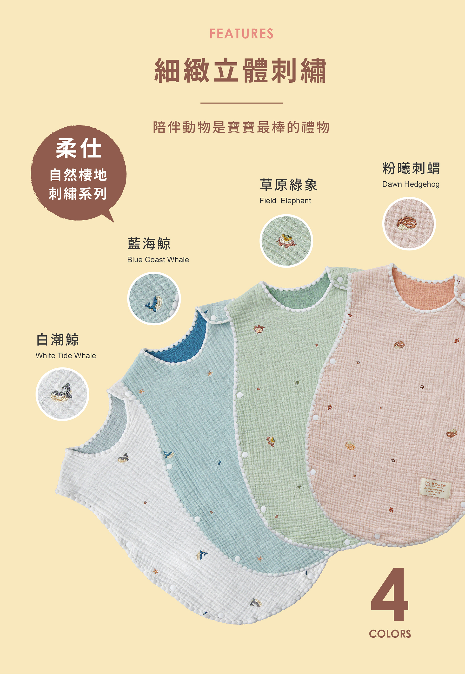 密針立體刺繡,精緻圖案增添童趣