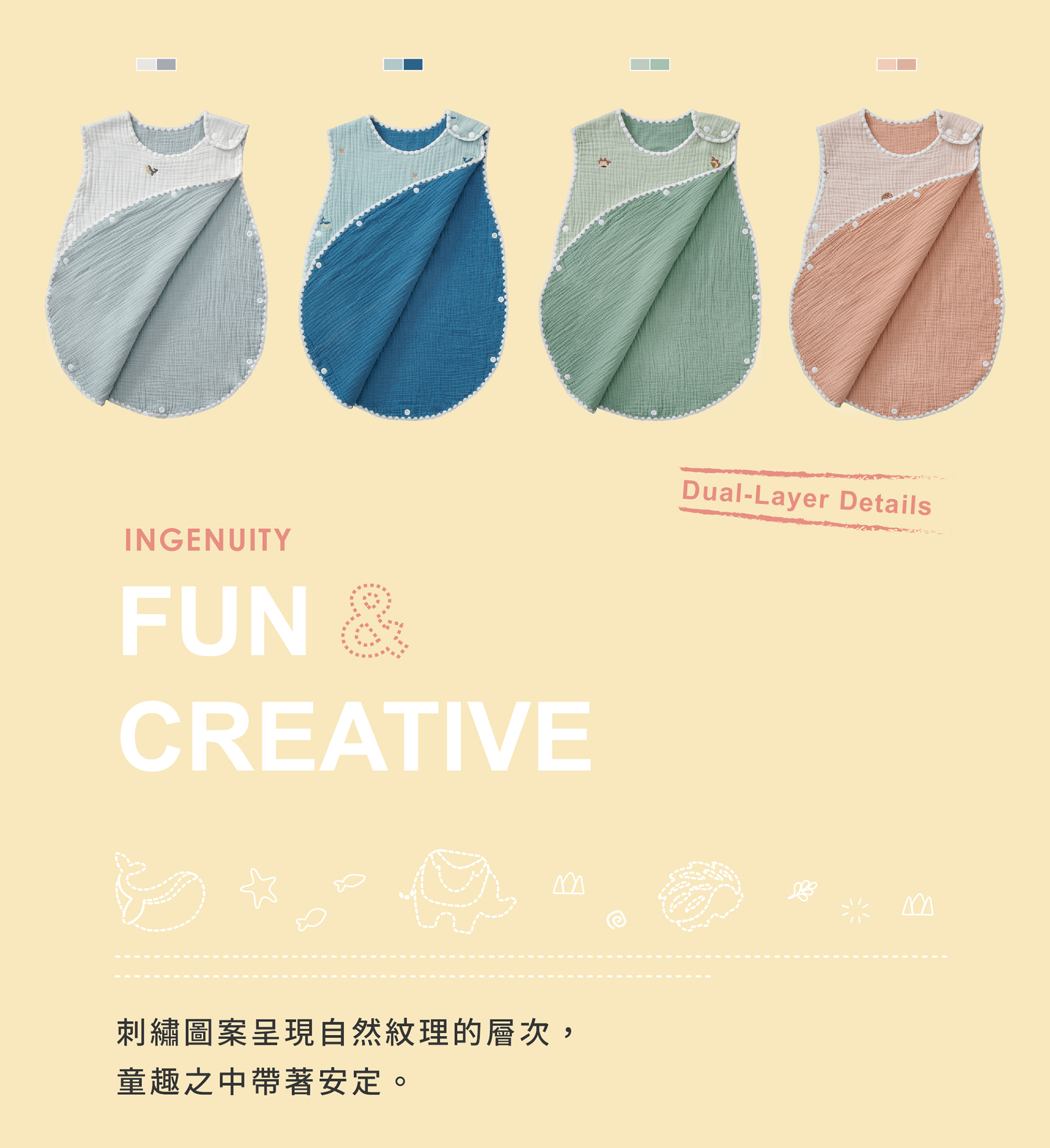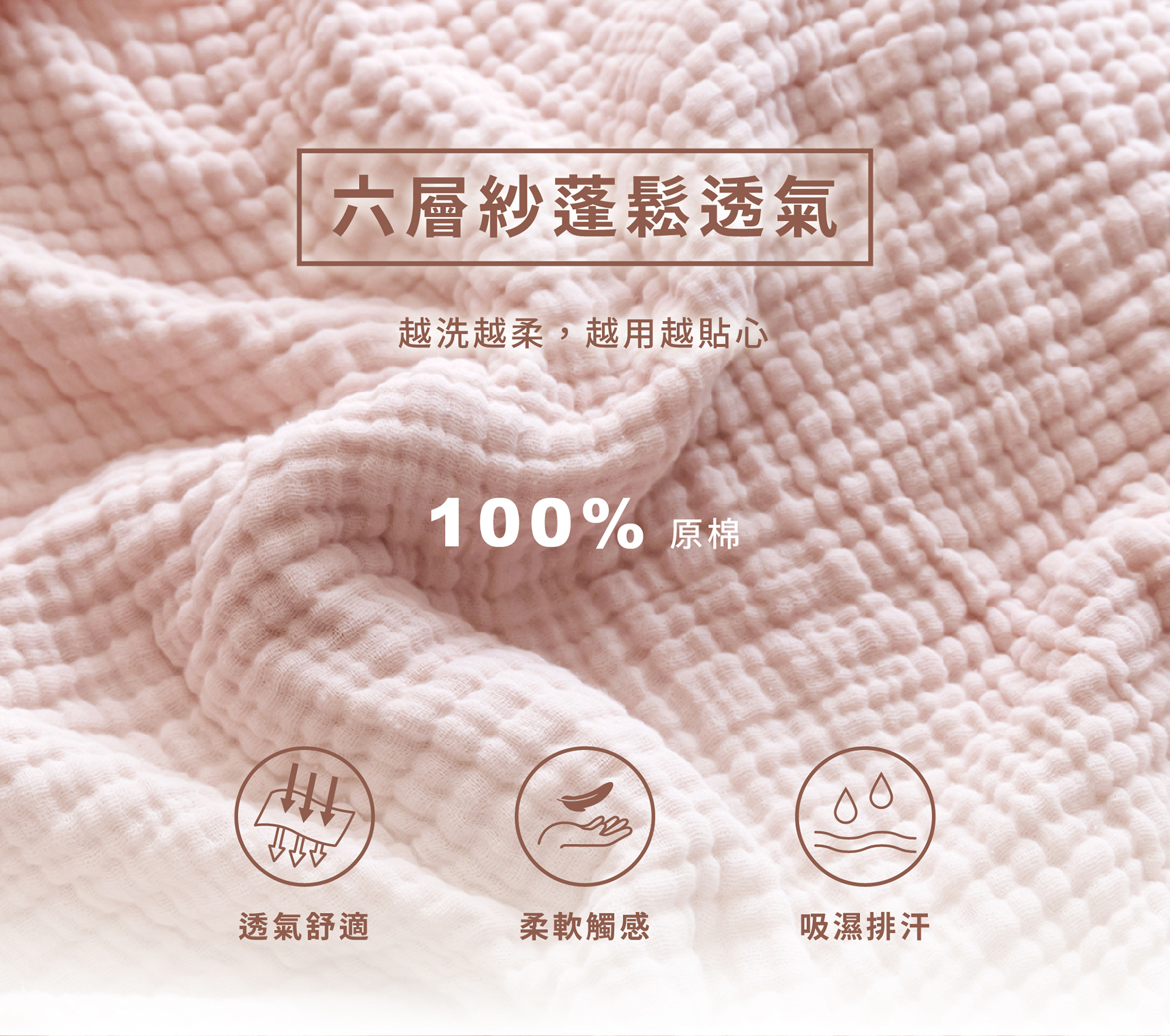 六層紗蓬鬆透氣,越洗越柔、越用越貼心