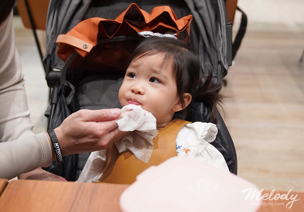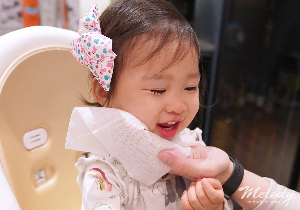 外出用完餐後擦嘴巴,我會先乾擦掉食物的殘渣,然後在加飲用水濕擦寶寶的臉。