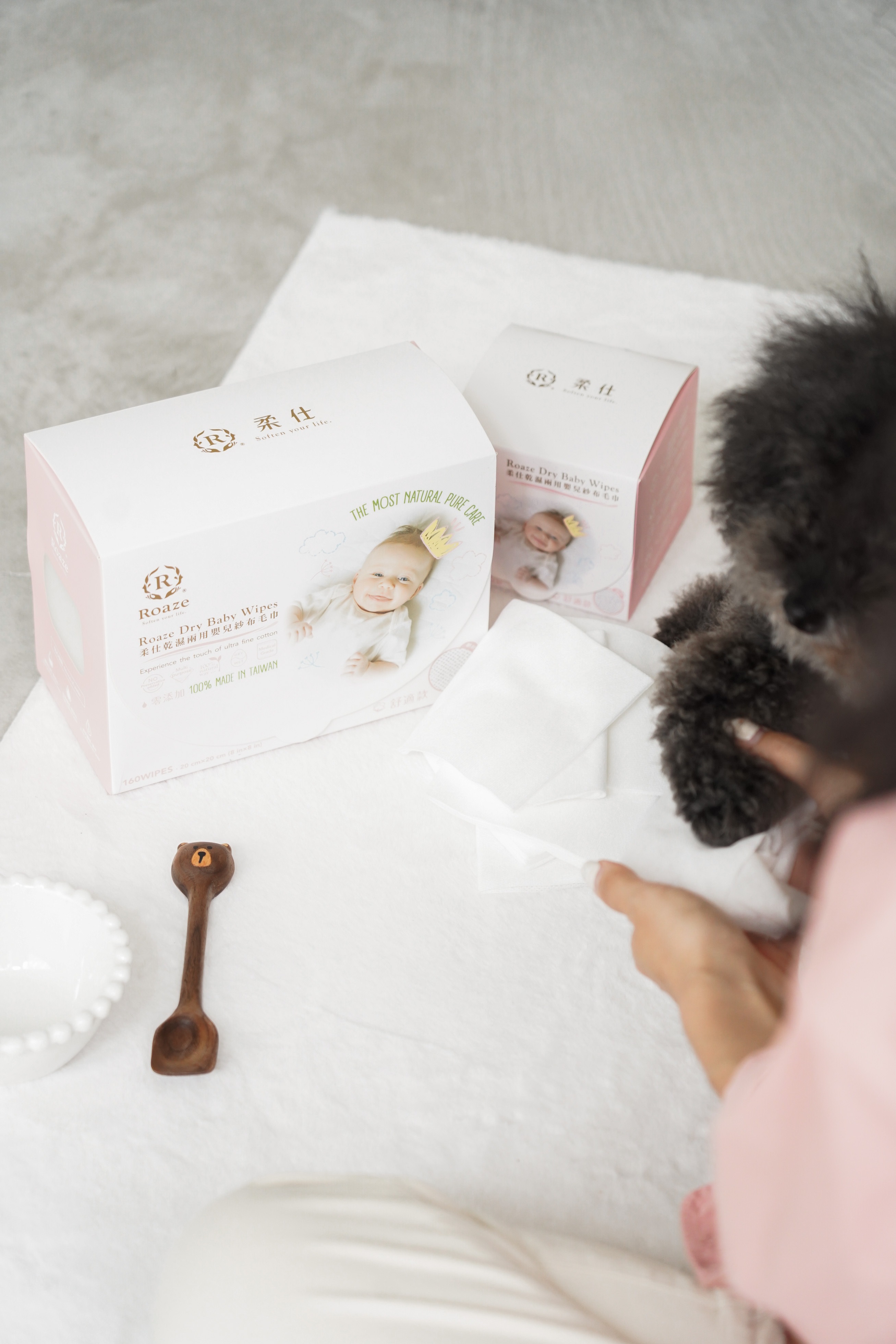 在不傷害牠們的皮膚情況下,我會盡量避免用濕紙巾,因為毛孩的皮膚其實比寶寶更脆弱,適合的成分也不一樣,可能會影響到毛孩皮膚的酸鹼值。所以我會選擇用柔仕的乾濕兩用紗布巾。