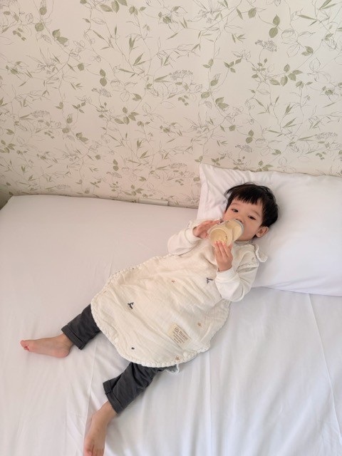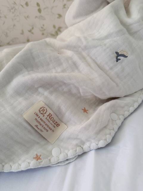 六層紗的厚度很剛好,不悶、不重,扣合方式很容易穿脫,又有一定的保暖度~ 晚上就算翻身、滾來滾去,但肚子那一圈會被包好好的,我終於也能一覺好眠。