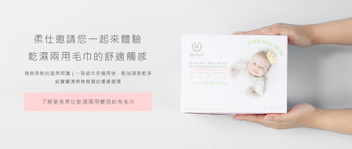新生兒階段都須使用天然零添加的柔仕乾濕兩用嬰兒紗布毛巾,取代嬰兒濕紙巾的用途,搭配勤換尿布加拍乾屁屁,幫寶寶杜絕所有化學成分。